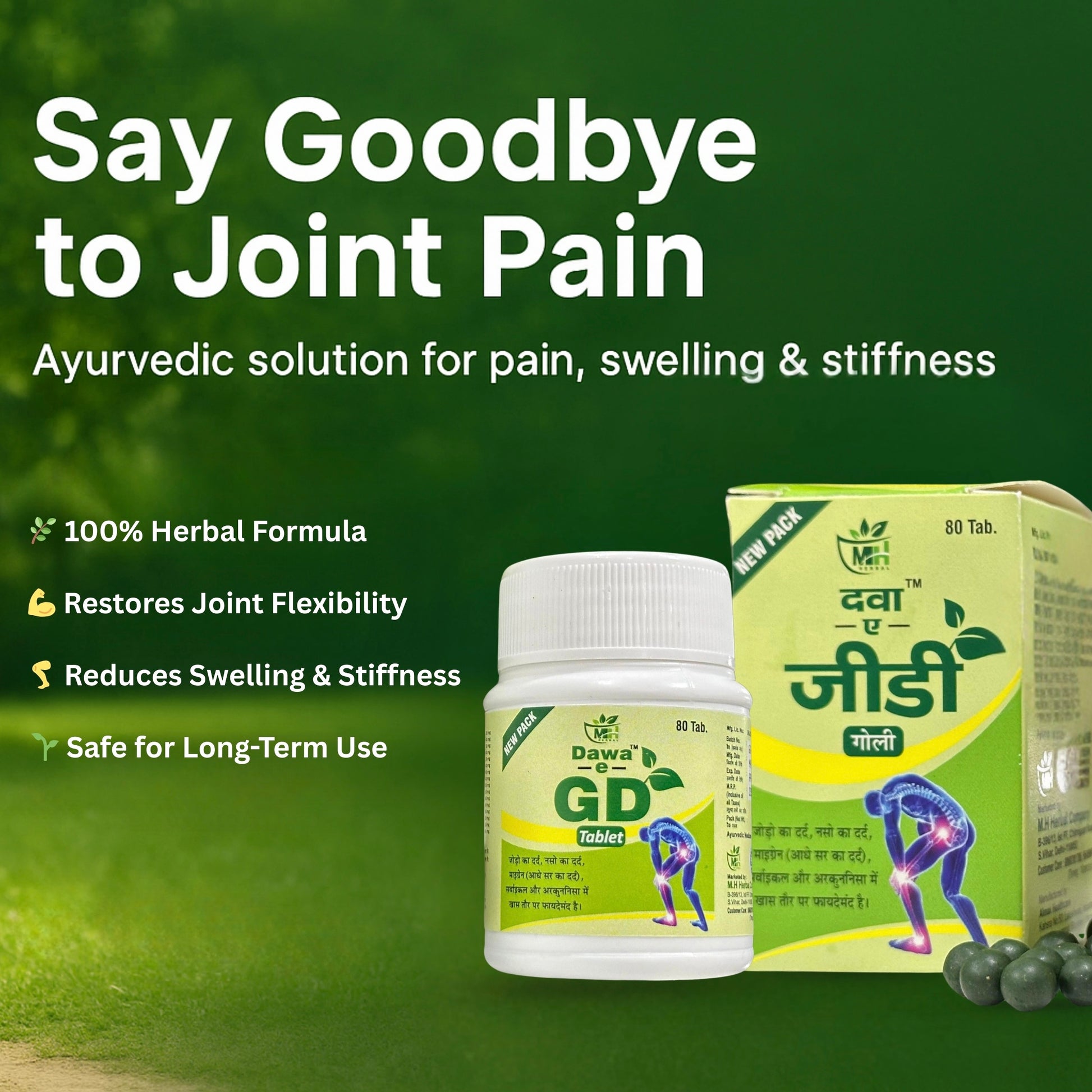 MH Herbal Dawa-e-GD Tablet supports relief from joint, nerve, and muscular pain. This ayurvedic supplement is ideal for people experiencing discomfort related to joints and nerves, and is beneficial for those with arthritis. Each new pack contains 80 tablets. Suitable for regular use under guidance.